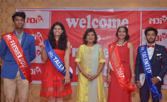 As a tradition and the legacy of NDIM, batch 2017-20 was welcomed in style with a Freshers Bash held on Sep 8th, 2017. The venue this year was Vibe by the LaLit Traveler. Full day event was filled with Dance, DJ, splendid ambience, flashing lights and foot tapping music! Mr. and Ms. Fresher 2017, were crowned by the Chairperson, Mrs. Bindu Kumar. Not only this, other talents were also presented awards and sachets for their personalities and talents. The enthusiasm was high, the organisation was spot on and the style quotient was through the roof! We thank Mrs. Bindu Kumar for honoring the event with her presence. Students are welcome to tag themselves.