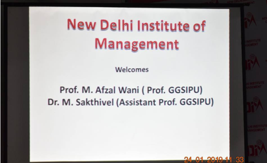 A seminar on “Impact of Intellectual Property Right on Business and Economic Growth” was organized by NDIM on Thursday, 24th January, 2019. The eminent speakers of the event were Prof (Dr.) M. Afzal Wani and Dr M. Sakthivel from USLLS, GGSIPU. Sharing their valuable experiences and thoughts Prof. Vani explained about the importance of transforming thoughts and ideas into knowledge. He emphasized on protection of innovative intellectual ideas through IPR. Dr. Dr M. Sakthivel explained about different legalities and acts involved in protection of intellectual property. The student and staff were enlightened about the concept and procedure related to Intellectual Property rights. The event came to a wonderful and successful end.